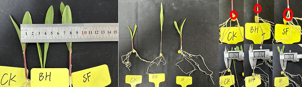 (1)針對(duì)玉米作物:在14℃~22℃培養(yǎng)條件下,對(duì)比其他種子處理劑,采用50g/100kg花粉多糖進(jìn)行玉米拌種處理,試驗(yàn)27天后發(fā)現(xiàn),花粉多糖處理后玉米株高生長(zhǎng)雖弱于其他種子處理劑,但莖粗、根鮮重、氣生根長(zhǎng)出率及氣生根根長(zhǎng)均顯著優(yōu)于,其中明顯看出其他種子處理劑處理后,玉米未生長(zhǎng)出氣生根。說(shuō)明花粉多糖拌種玉米,可明顯增加玉米氣生根生長(zhǎng),提升玉米后期抗倒伏能力。