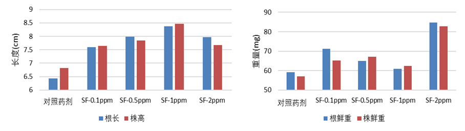(2)針對(duì)小麥作物:浸種處理后發(fā)現(xiàn),試驗(yàn)范圍內(nèi)的花粉多糖對(duì)小麥株高、根長(zhǎng)、株重、根重均具有促進(jìn)作用,其中在2 ppm處理下,相比陽(yáng)性對(duì)照處理,花粉多糖處理后小麥株高、根長(zhǎng)、株重及根重分別增長(zhǎng)12%、24%、45%、43%。