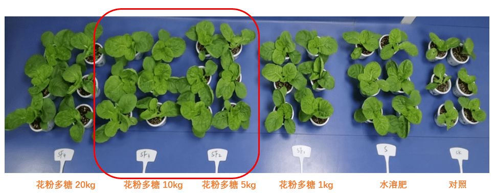 (2)根據(jù)復(fù)合肥施用量,設(shè)計(jì)減量復(fù)合肥20%,同時(shí)進(jìn)行不同用量花粉多糖復(fù)配,即全量肥(60kg/畝)、減量肥(48kg/畝)、減量復(fù)配花粉多糖3、5、10kg/t。通過(guò)測(cè)試發(fā)現(xiàn),相比全量復(fù)合肥處理,減量+花粉多糖10kg/t處理后,小白菜地上部分鮮重、根長(zhǎng)、根重、冠幅、葉長(zhǎng)、葉寬分別增加26.5%、42.2%、123.8%、7.7%、1.6%、9.3%,促進(jìn)效果明顯。結(jié)合成本計(jì)算,減量后添加花粉多糖可達(dá)到降本增效的目的。
